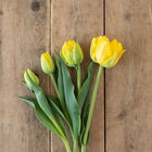 When the flowers show color, but before they begin to open. For optimal stem length, harvest by reaching to the base of the stem and gently pulling straight up. This method will add 3–6" of stem length, compared to cutting the stems at the soil line. For longer term holding/storage: Tulip flowers can be harvested with the bulb on the stem by lifting the bulbs with a garden fork and pulling up. Harvesting with the bulb in place (attached to the stem) provides a food source for the tulip during long-term storage. Stand tulips upright or bunch and wrap stems in paper to keep the stems straight in storage. For the home garden, if treating as a garden perennial: Avoid taking leaves when harvesting flowers, they are needed to manufacture energy for next year's blooms.Deadhead any blooms you do not harvest. Wait until the plant leaves have turned brown before mowing over. Store stems in plain, clean water.