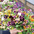 2–3" deeply ruffled flowers in multicolor combinations of purple, burgundy, plum, gold, lavender, mauve, and ivory. Some variability in bloom size, degree of frill, and plant height across the mix. Mildly fragrant blooms. Overwinters well in our unheated tunnel (Zone 5), yielding 12–14" long stems that are perfect for mixing with tulips and daffodils in early spring bouquets. Also known as pansy, Johnny jump-up, European field pansy, heart's ease, and hybrid violet.Specs:
